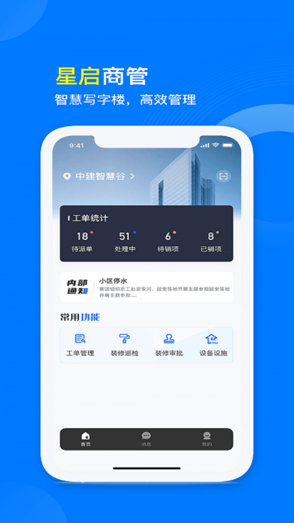 星启商管APP面向写字楼的招商租赁公司、物业管理公司管理人员和员工提供移动办公工具,包含工单管理、设备巡检、装修管理等功能,旨在让物业员工、资管人员更轻松的完成工作,让管理层更便捷的统筹工作,以提高招商租赁公司、物业管理公司整体工作效率。